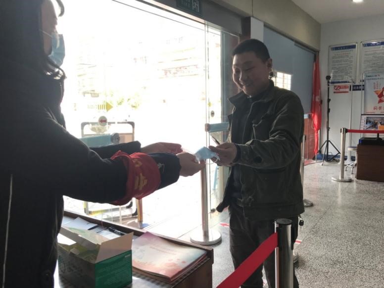 “請留步稍等!我們這邊將自己的備用口罩,送您一只!疫情還未結(jié)束,防疫不能放松。下次進大廳請您記得一定要佩戴口罩!”