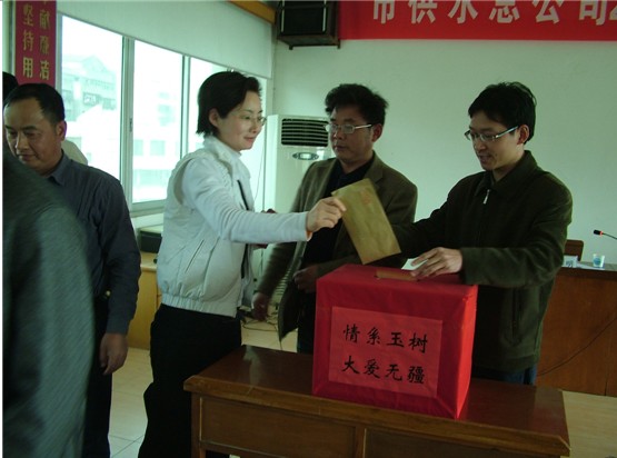 4月26日,荊門市供水總公司舉行“情系玉樹 大愛無疆“捐款活動(dòng),供水職工慷慨解囊、捐款踴躍,短短的時(shí)間,共募得善款18170元,圖為捐款現(xiàn)場場景。
