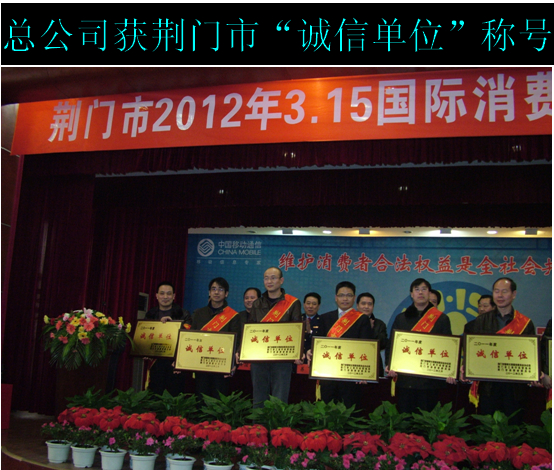 3.15國(guó)際消費(fèi)日前夕,在荊門(mén)市開(kāi)展的“萬(wàn)名消費(fèi)者評(píng)誠(chéng)信”活動(dòng)中,經(jīng)過(guò)廣大消費(fèi)者投票評(píng)選,荊門(mén)市供水總公司被市文明委、市工商行政管理局、市消委聯(lián)合授予“誠(chéng)信單位”,并取得第三名的好成績(jī)。圖為黨委書(shū)記陳永根在表彰會(huì)上接受牌匾。
