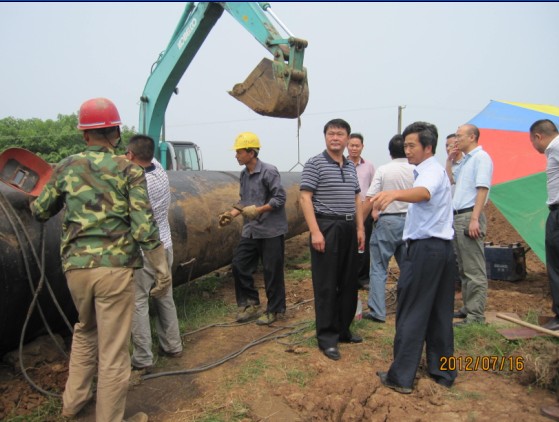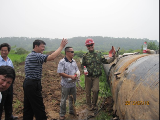 總經理陳衛(wèi)國(左四)、黨委書記陳永根(右二)在城區(qū)安全飲水工程施工現(xiàn)場聽取施工負責人匯報,要求加快進程,確保質量,按時完工,向全市人民交上一份合格答卷。
