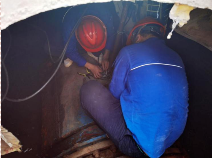 廠領(lǐng)導(dǎo)在綜合評估后,同意其思路,并作安全操作提醒。雖早有心理準(zhǔn)備,但在打開接線盒后的瞬間,李為龍等人還是倒吸一口涼氣。他們發(fā)現(xiàn)整個(gè)接線盒內(nèi)部被深色不透明的膠體充滿,無法掌握線路走向。短暫思索后,他們發(fā)揮水務(wù)人不怕苦、能戰(zhàn)斗的精神,嘗試按廠家給出建議,用熱風(fēng)槍加熱密封膠,但事與愿違,效果并不理想,密封膠沒有自動融化流出。李為龍“改巧為笨”,在加熱的同時(shí)用小刀清理變軟的膠體。該處操作空間狹小,且不能損壞內(nèi)部的線路和接線端子,必須凝神聚力,是個(gè)“精細(xì)活”“體力活”。即便同事們輪番上陣,依然個(gè)個(gè)汗如雨下。功夫不負(fù)有心人,眾人合力熬過“漫長的”4小時(shí),最終完成了既定任務(wù)。