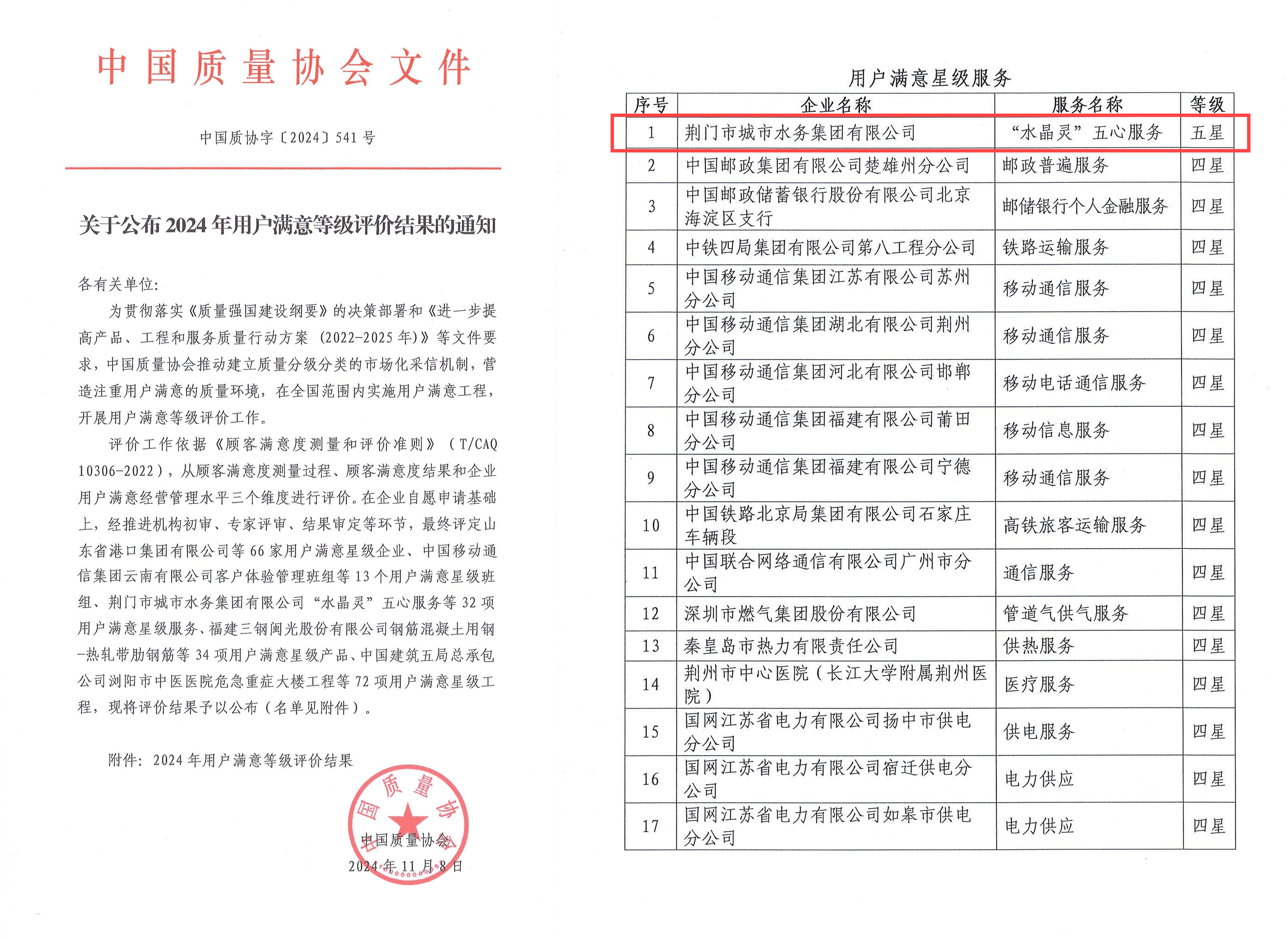 11月8日,中國(guó)質(zhì)量協(xié)會(huì)公布2024年用戶(hù)滿(mǎn)意等級(jí)評(píng)價(jià)結(jié)果,荊門(mén)市城市水務(wù)集團(tuán)有限公司(以下簡(jiǎn)稱(chēng)“集團(tuán)”)以“水晶靈”五心服務(wù)模式為特色,成為全國(guó)唯一一家獲評(píng)服務(wù)類(lèi)五星的企業(yè),標(biāo)志著在供水服務(wù)領(lǐng)域已經(jīng)成為全國(guó)標(biāo)桿。