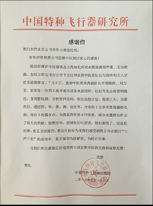 7月28日,605所相關(guān)負(fù)責(zé)人一行2人專程到公司送上“全心全意服務(wù)企業(yè)”錦旗和一封感謝信,表達公司免費為其探測漏、減少其水量損失的謝意。