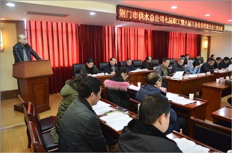 會議在莊嚴的國歌聲中開幕。公司黨委書記、總經理陳永根作了《2016年度公司工作報告》,認真總結了2016年度取得的各項成績;供水設施建設投資體制理順、5條道路供水管道改遷提前完成、國賓酒店環(huán)評獲批;管黨治黨高度前所未有、項目建設力度規(guī)??涨?、公司主輔業(yè)產值連續(xù)五年雙過億,總額首次突破3億元等。客觀分析了當前企業(yè)發(fā)展存在的機會和挑戰(zhàn),并對2017年度的工作作出了展望。黨委委員、工會主席馬兆芳,黨委委員、總會計師劉高軼分別作了《2016年度工會委員會工作報告》、《荊門市供水總公司2016年度財務預算執(zhí)行及2017年財務預算草案編制報告》、《荊門市供水總公司2016年度工會經費執(zhí)行及2017年工會經費預算情況報告》。職工代表提案審查小組組長卞軍虎對七屆職工暨八屆工會會員代表大會二次會議職工代表提案辦理情況作了報告,七屆職工暨八屆工會會員代表大會二次會議共收到34份職工提案,實際需要回復和辦理的提案為32份,已辦結的有27份,正在落實的5份,報告中對正在落實的提案進行了說明。工會副主席張春生對本次會議征集職工代表提案作了報告,本次會議共收到19份提案,其中涉及經營管理的5份,技術改革的1份,教育培訓的1份,薪資福利待遇的12份。會議期間,與會代表給予六個報告充分肯定,圍繞各項工作報告,進行了熱烈討論,提出了許多寶貴的建議和意見。