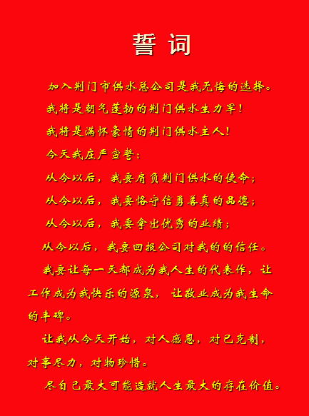 為進(jìn)一步激發(fā)供水人做好本職工作的榮譽(yù)感、使命感和責(zé)任感,11月9日下午,市供水總公司在五樓會(huì)議室首次舉行新進(jìn)員工入職宣誓儀式,讓他們用誓言表達(dá)對(duì)企業(yè)、對(duì)供水職業(yè)的忠誠。