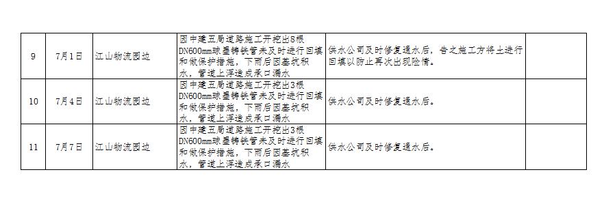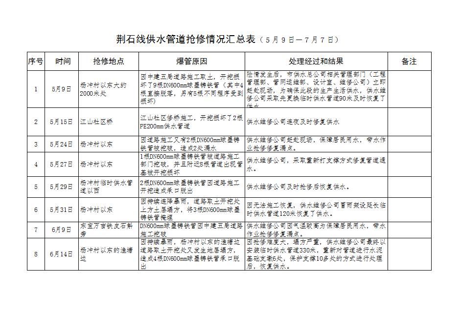 附:1、《荊石線(xiàn)供水管道搶修情況匯總表(5月9日-7月7日)》