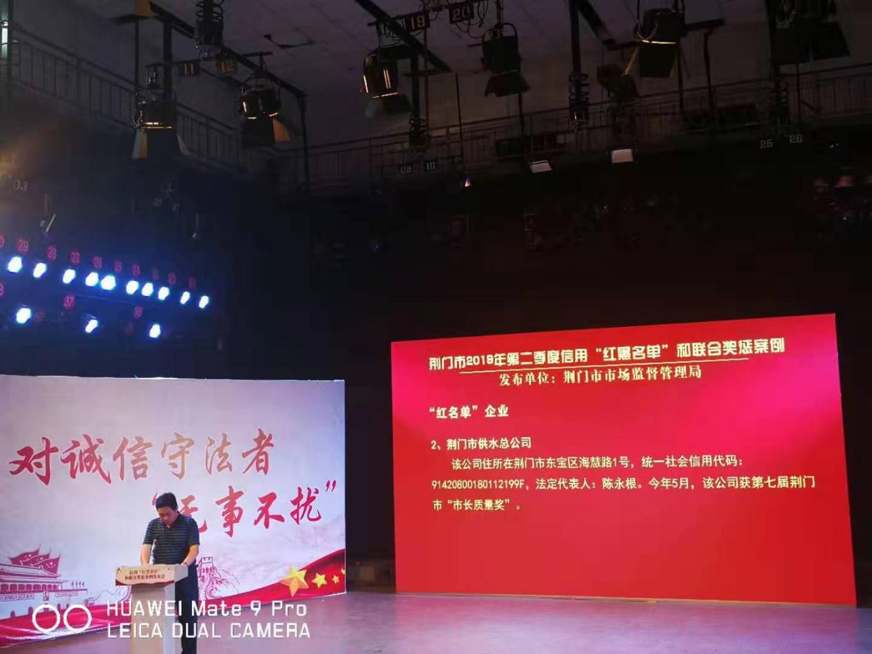 7月24日下午,荊門市社會信用體系建設(shè)領(lǐng)導(dǎo)小組辦公室、市發(fā)改委、人行荊門市中心支行聯(lián)合組織召開第二季度信用“紅黑名單”和聯(lián)合獎懲案例發(fā)布會。會上,市供水總公司被授予“全市市場監(jiān)管領(lǐng)域守信企業(yè)”榮譽稱號,入選荊門市守信企業(yè)“紅名單”。