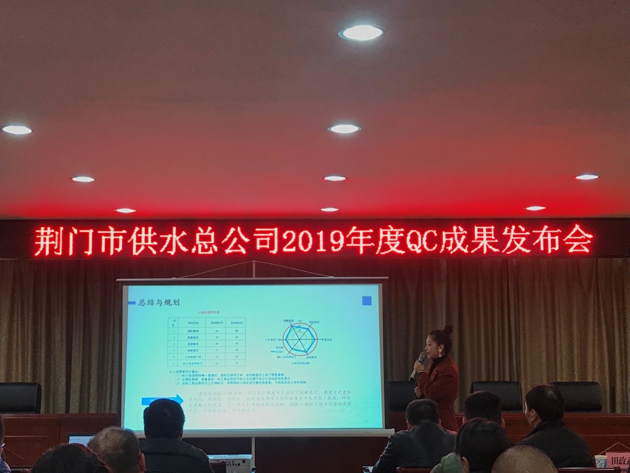 12月6日,荊門市供水總公司首屆QC成果發(fā)布會(huì)在總公司六樓會(huì)議室順利召開,質(zhì)量專家、國家級(jí)評(píng)審員劉佐光老師、荊門市質(zhì)量協(xié)會(huì)田政武秘書長、公司副總經(jīng)理徐安祥及各部門主要負(fù)責(zé)人參加了發(fā)布會(huì),會(huì)議由QC工作組組長劉昕平主持。