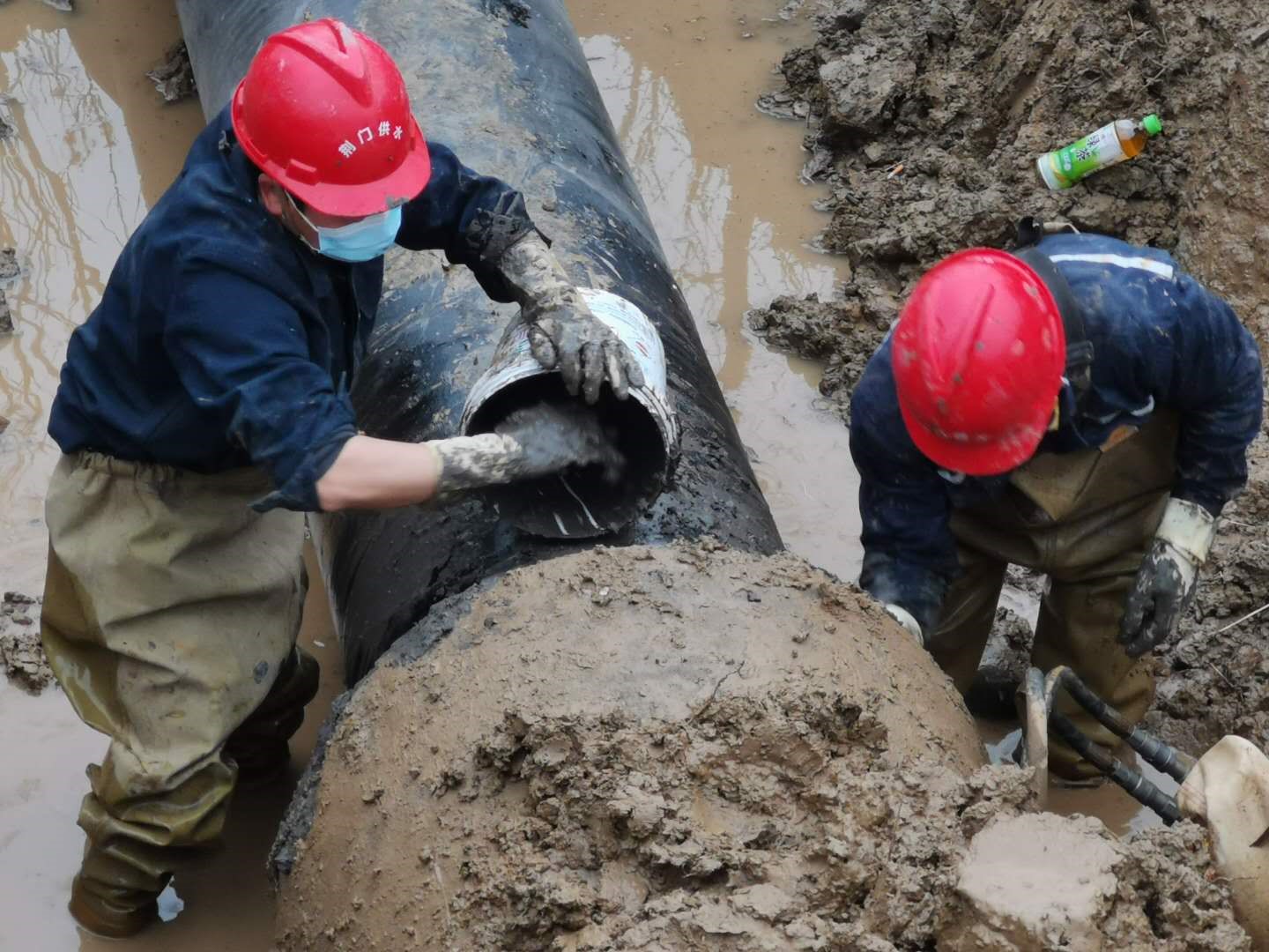 2月23日10時,掇刀區(qū)迎春大道人福藥業(yè)門前DN600mm主供水管道突發(fā)爆管,供水維修部門迅速啟動疫情期間應急搶修預案,組織人員、工程機械、維修設備趕赴現(xiàn)場,經過9個多小時的緊張搶修,于當日晚7點42分恢復了供水。緊接著次日8點,東寶區(qū)科陽路DN600mm主供水管道突發(fā)爆管,巡查人員現(xiàn)場核實后迅速止水,并及時通告用戶停水信息后開始倒閘排水,到13時左右開挖出爆管的DN600的主供水管道出現(xiàn)在大家面前,相比前日的搶修,整段水管因裂口較大損壞嚴重,不能簡單修復,只能現(xiàn)場立即制定可靠的管道更換維修方案。當時,全部工作人員從早上到現(xiàn)場已經工作了5個小時,滴水未進,但大家為保障搶修進度,仍然堅持一邊加班加點對基坑進行處理,一鼓作氣將破損管道清理出來,做好對接管道的清淤工作。另一邊搬運快干水泥,切割、加工、運輸、吊裝管道,14點35分把全部材料物資運抵現(xiàn)場開始作業(yè)。隨后,大家在泥地里匆匆啃了幾口方便面后,又投入到緊張的搶修工作中,終于在18點17分完成了維修,待水泥養(yǎng)護好后,于21點27分通水,及時保障了科陽路企業(yè)和周邊居民的正常生產生活用水。