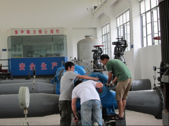 近日,氣溫逐漸攀升,為確保高峰供水時供水設備的正常運行,市供水公司加壓站組織維修人員搶前抓早、多措并舉,加強對供水設施、設備的維修保養(yǎng)。圖為加壓站維修人員在維護3#送水泵。